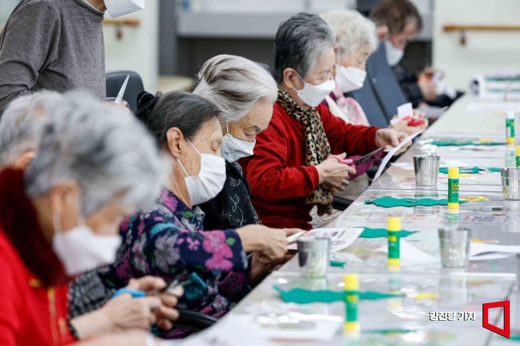 6일 서울 성북구 길음데이케어센터에서 어르신들이 만들기 활동을 하고 있다. 일명 '노치원'(노인+유치원)으로 불리는 데이케어센터는 요양시설에 갈 정도는 아니지만, 초기치매 등 노인성질병으로 혼자서 일상생활이 어려운 노령층(장기요양1~5등급)을 돌봐주는 시설이다. 강진형 기자