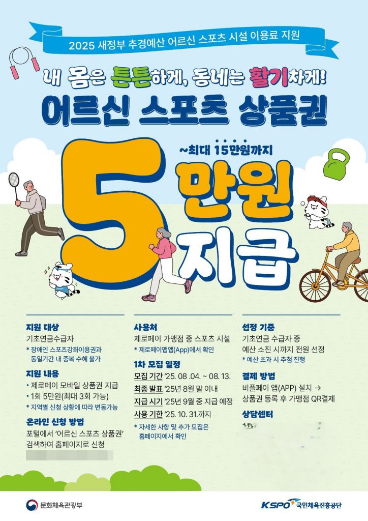 문화체육관광부와 국민체육진흥공단이 주관하는 이 사업은 기초연금 수급 어르신들에게 체육활동 기회를 제공해 건강한 노후 생활을 지원하는 것을 목표로 한다. 지원 대상자로 선정되면 1인당 1회 5만원, 최대 3회 15만원까지 스포츠 모바일 상품권을 지급받을 수 있다.
