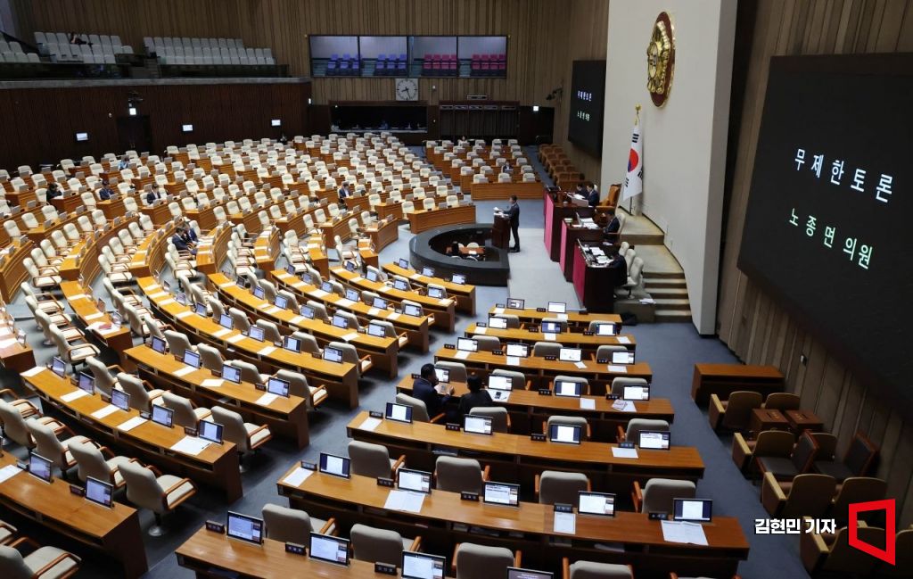 노종면 더불어민주당 의원이 5일 국회 본회의에서 '방송3법(방송법·방송문화진흥회법·한국교육방송공사법 개정안)' 상정과 관련한 무제한토론(필리버스터)을 하고 있다.