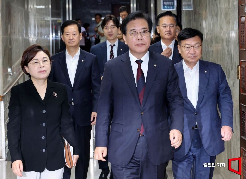 송언석 국민의힘 비상대책위원장 겸 원내대표가 5일 국회에서 열린 원내대책회의에 참석하고 있다.