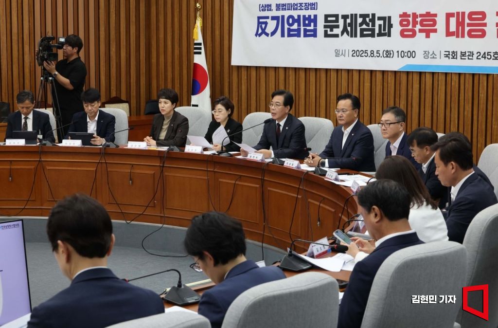 송언석 국민의힘 비상대책위원장 겸 원내대표가 5일 국회에서 열린 '반기업법(상법, 불법파업조장법) 문제점과 향후 대응 긴급 간담회'에서 발언하고 있다.