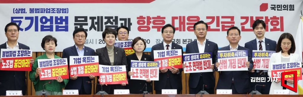송언석 국민의힘 비상대책위원장 겸 원내대표가 5일 국회에서 열린 '반기업법(상법, 불법파업조장법) 문제점과 향후 대응 긴급 간담회'에서 김정재 정책위의장, 유상범 원내수석부대표 등 참석자들과 피켓을 들고 구호를 외치고 있다.
