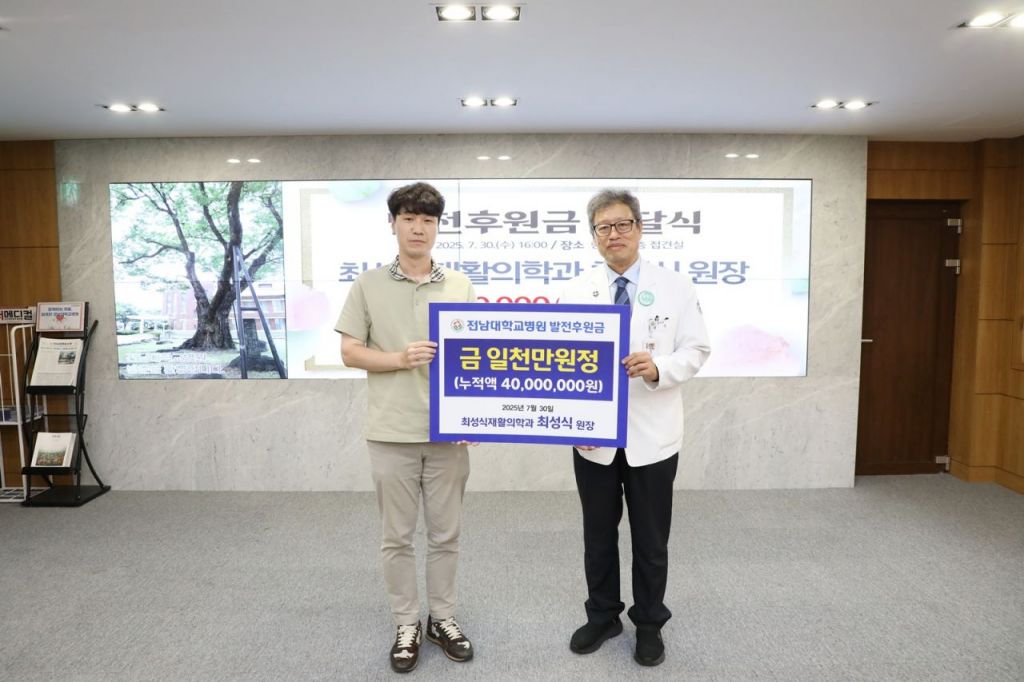 전남대학교병원은 전남 곡성 최성식재활의학과 최성식 원장이 발전후원금 1,000만원을 기탁했다고 5일 밝혔다. 이번 후원금 전달로 최 원장의 전남대학교병원 누적 후원금은 총 4,000만원에 달한다.