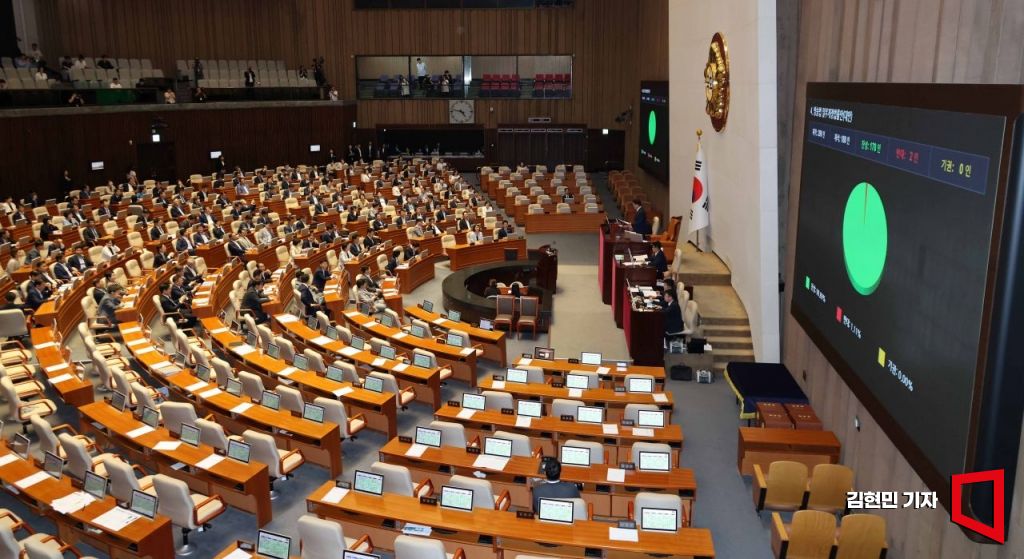 5일 국회에서 열린 본회의에서 방송법 일부개정법률안이 국민의힘 의석이 비어 있는 가운데 통과되고 있다. 2025.8.5 김현민 기자