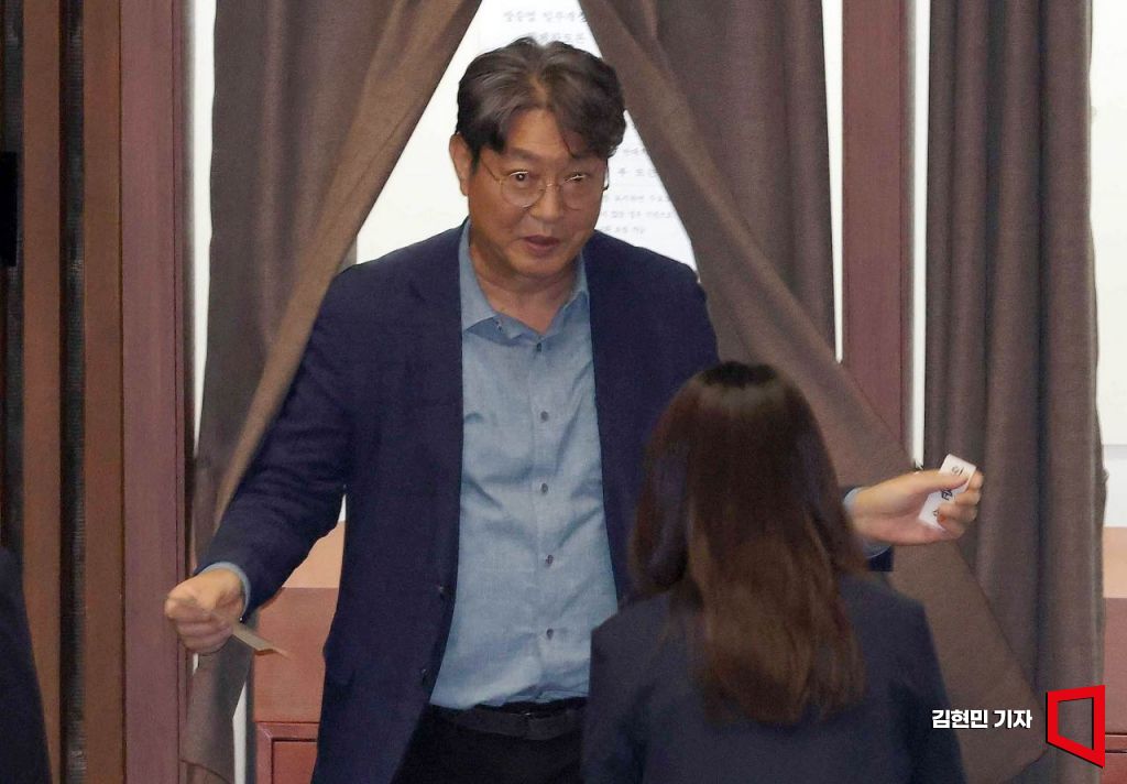 '차명거래 논란'에 휩싸인 이춘석 더불어민주당 의원이 5일 국회에서 열린 본회의에서 무제한토론 종결동의안에 대한 투표를 하고 있다.