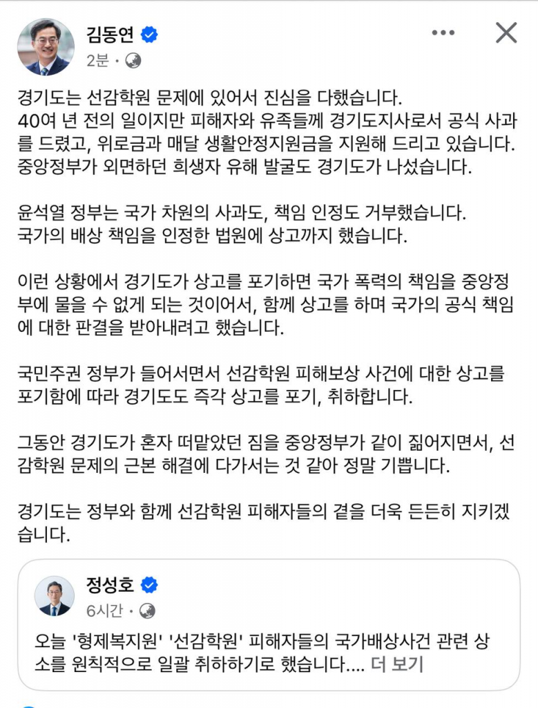 김동연 경기도지사는 5일 자신의 사회관계망서비스(SNS)에 올린 글에서 "국민주권 정부가 들어서면서 선감학원 피해보상 사건에 대한 상고를 포기함에 따라 경기도도 즉각 상고를 포기, 취하한다"고 밝혔다.