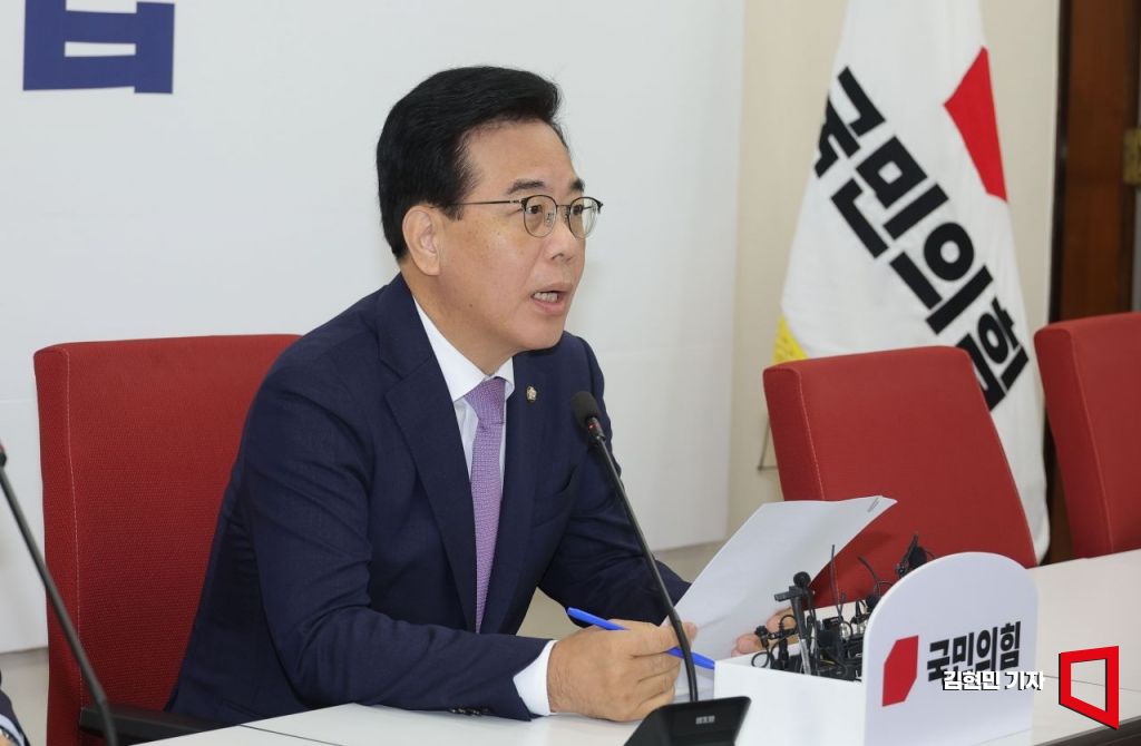 송언석 국민의힘 비상대책위원장 겸 원내대표가 6일 국회에서 열린 현안 관련 기자간담회에서 발언하고 있다. 2025.8.6 김현민 기자