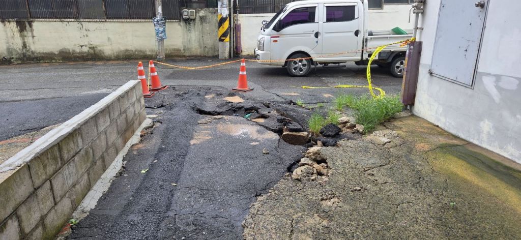6일 남구 주월2동 한 골목이 최근에 내린 극한 호우로 침수 피해를 입어 도로가 파손돼 있다. 민찬기 기자