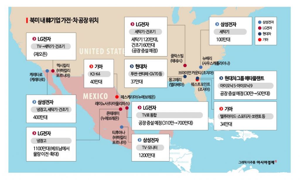 이에 따라 멕시코에 생산기지를 보유한 기업들은 현상 유지는 물론 증설도 검토하고 있다. LG전자는 관세 부과 전부터 멕시코 생산기지 재정비를 추진해 왔으며 생산 품목의 효율적 재배치를 진행 중이다. LG전자 관계자는 "멕시코에서 북미로 수출되는 완제품의 경우 현재 무관세가 적용되기 때문에 상대적으로 유리한 측면이 있다"며 "멕시코에서 무관세 유지가 가능하다고 판단해 생산 품목 전환에 나선 것"이라고 설명했다. 이어 "관세뿐 아니라 원자재 수급 비용, 물류비용 등 제반 비용을 고려해 경쟁력을 판단한 결과 현재로선 멕시코가 가장 유리하다고 보고 있다"고 말했다.