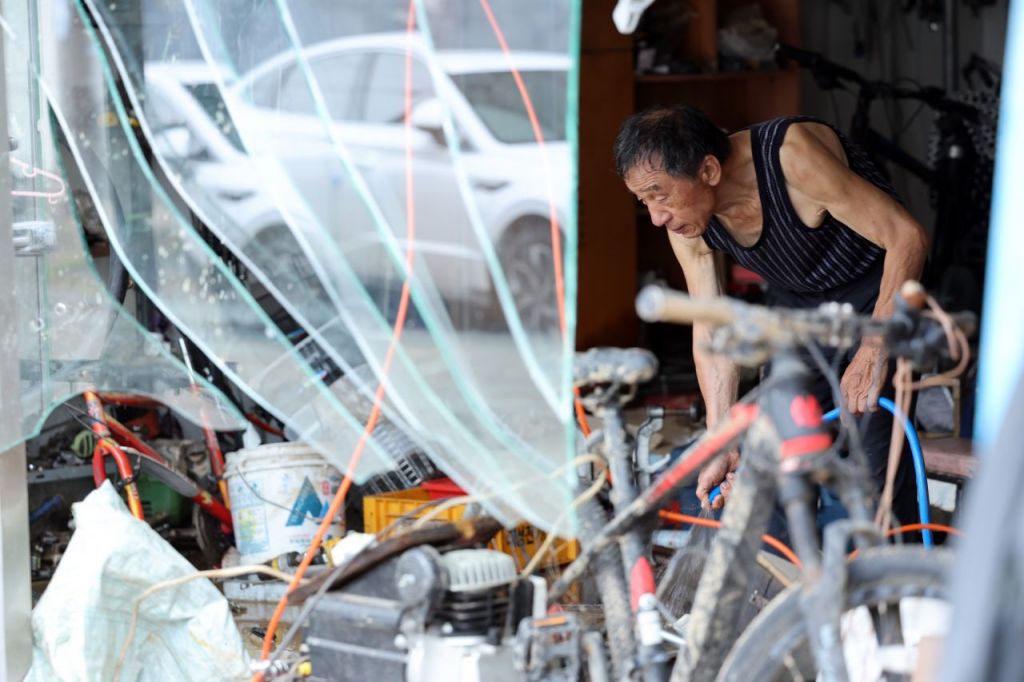 17일만에 극한호우가 다시 내린 4일 광주 북구 신안동 한 상점에서 주민이 흙탕물을 씻어내고 있다. 연합뉴스