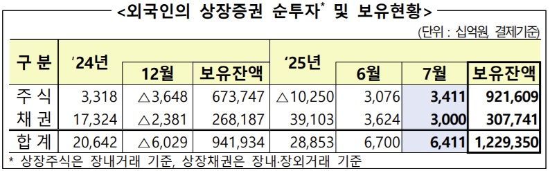7일 금융감독원이 발표한 '2025년 7월 외국인 증권투자 동향'에 따르면 결제기준 지난달 외국인은 상장주식 3조4,110억원을 순매수했다. 시장별로는 코스피에서 3조7830억원을 순매수했으며 코스닥에서 3720억원을 순매도했다.