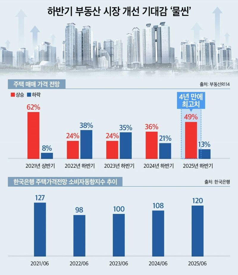 부동산R114가 6.27 대책 시점과 겹친 조사에서 내놓은 '2025년 하반기 주택 시장 전망'에 따르면 설문에 응한 수요자 중 49%가 주택 매매 가격이 상승할 것으로 전망했다. 이는 부동산 최대 호황기로 손꼽히는 2021년 이후 4년 만에 가장 높은 수치이며, 하반기 집값 상승에 대한 기대심리가 살아나고 있음을 보여주는 명확한 예시다.