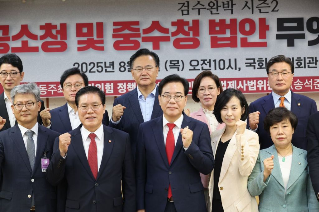 국민의힘은 7일 더불어민주당이 추석 전에 검찰개혁 법안을 통과시키기 위해 속도전에 나서자 "정치 권력형 범죄를 덮기 위해 검찰청 폐지를 진행한다면 법치주의가 무너진다"며 재차 규탄했다.