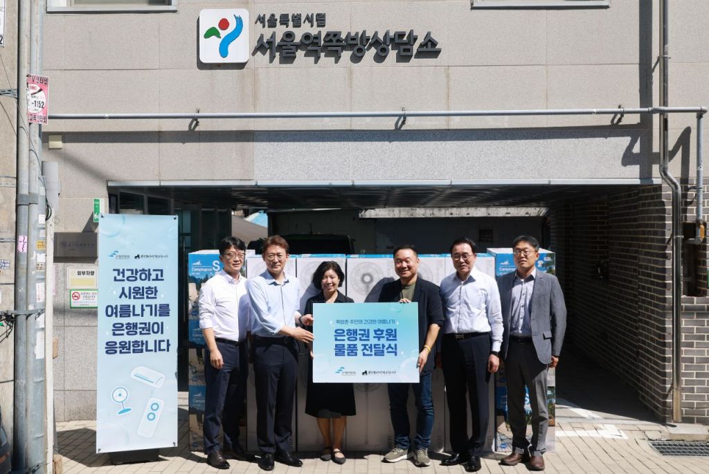 권대영 금융위원회 부위원장(왼쪽 두번째)이 지난 5일 오전 서울 용산구 서울시립 서울역쪽방상담소에서 은행연합회가 주관한 '은행권 폭염 대비 쪽방 거주민들의 기후위기 극복을 위한 후원금 전달식'에 참석해 기념촬영을 하는 모습. 금융위