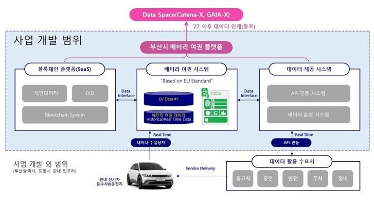 '배터리 여권 플랫폼 구축'은 블록체인 기술을 활용해 전기차 배터리의 충전·안전, 성능점검, 이력관리 등 전 주기 데이터를 수집·관리하는 시스템이다. 부산시를 비롯해 부산산학융합원, 포항시, 한국전기차산업협회, 민간사업자인 ㈜피엠그로우 컨소시엄이 공동으로 사업을 수행한다.