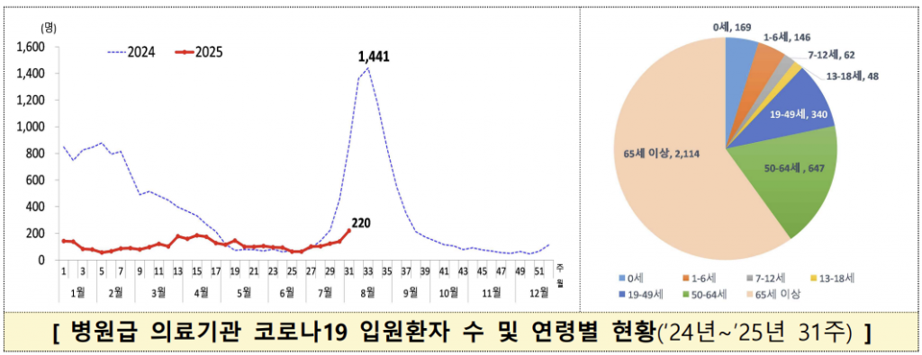병원급 의료기관의 주간 입원환자 수는 26주차(6월22~28일) 63명, 27주차 101명, 28주차 103명, 29주차 123명, 30주차 139명, 31주차 220명으로 5주 연속 늘었다. 연령별로는 65세 이상이 전체 입원환자(3526명)의 60.0%(2114명)로 가장 많고, 50~64세가 18.3%(647명), 19~49세 9.6%(340명) 등의 순이었다.