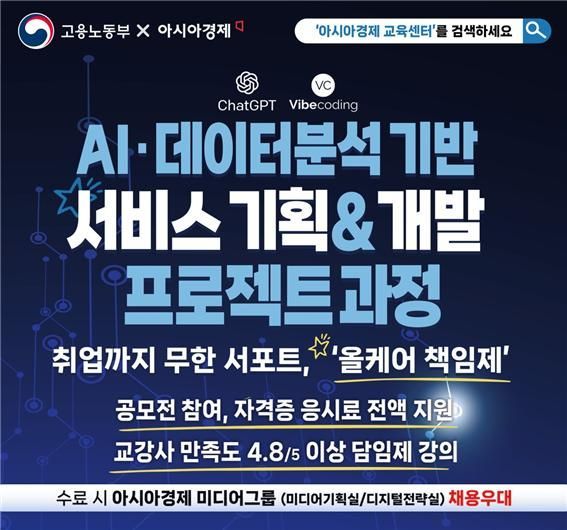아시아경제 교육센터가 인공지능(AI)과 데이터 분석 기술을 바탕으로 마케팅, 유통, 제조 등 다양한 산업 분야에서 필요로 하는 서비스 모델 기획·개발 인재를 양성하기 위한 신규 교육과정 훈련생을 모집한다.