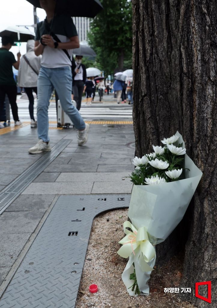 1일 밤 서울 시청 근처에서 승용차가 교차로를 역주행하며 행인을 덮쳐 9명의 사망자를 낸 사고 현장 근처에 2일 아침 누군가가 국화 꽃다발을 가져다 놓았다. 사진=허영한 기자 younghan@