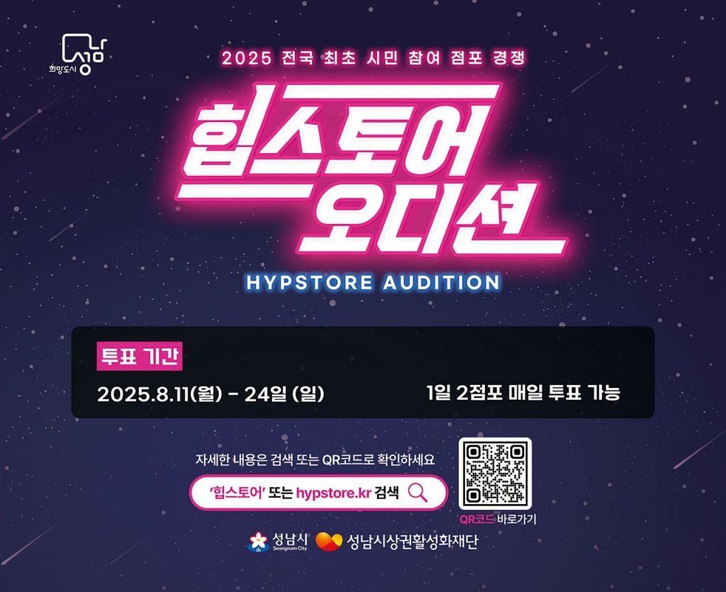 성남시상권활성화재단(이사장 신상진)은 전국 최초 시민 참여형 점포 서바이벌 프로그램인 '2025 힙스토어(Hypstore) 오디션' 시민투표를 11일부터 24일까지 진행한다고 밝혔다.