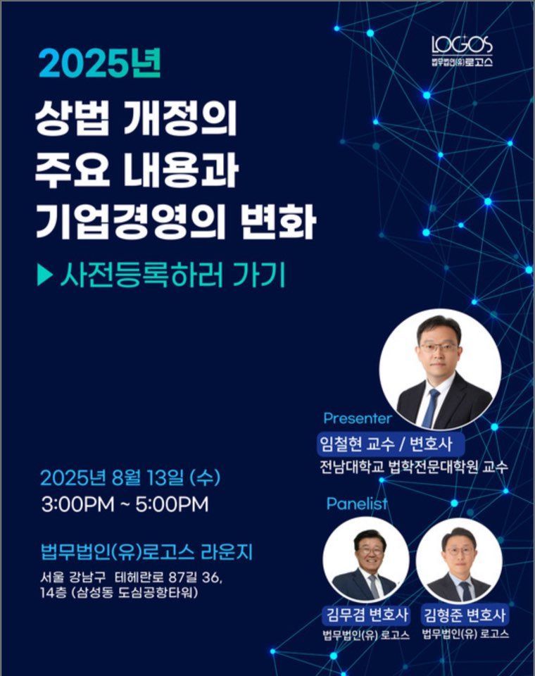 법무법인 로고스는 오는 13일 오후 3시 서울 강남구 삼성동 도심공항타워 14층 로고스 라운지에서 '2025년 상법 개정의 주요 내용과 기업경영의 변화'를 주제로 한 상법 세미나를 개최한다고 11일 밝혔다.