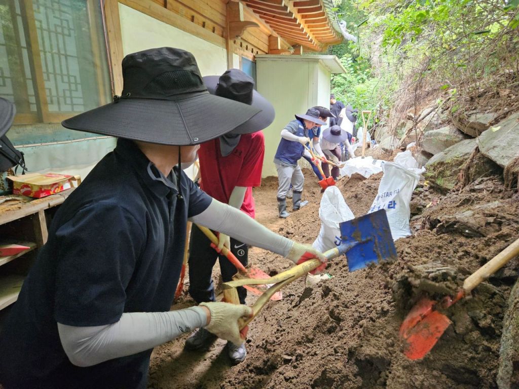 코트라는 8일 집중호우로 큰 피해를 입은 경기도 가평군 상면에서 노사합동 수해복구 봉사활동을 실시했다. 사진=코트라