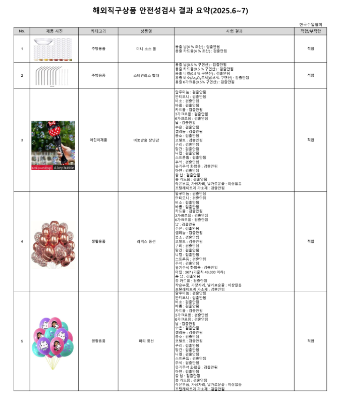 한국수입협회는 여름 휴가철에 앞서 지난 6~7월 해외직구로 유통되는 물놀이용품 및 여름 시즌 제품에 대해 안전성 검사를 실시했다고 11일 밝혔다. 이는 협회가 지난해 9월 알리익스프레스 코리아와 체결한 해외직구상품 안전관리 강화를 위한 업무협약(MOU)의 일환으로, 계절별 수요가 높은 상품에 대한 집중 검사를 통해 소비자 피해를 예방하고 시장 신뢰도를 높이기 위한 취지에서 진행됐다.