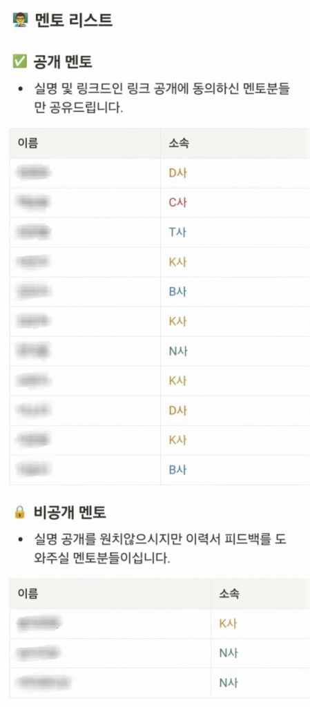 이력서 첨삭 서비스를 제공한 '네카라쿠배당토' 현직자 멘토 명단. 알파벳은 각 회사의 이니셜로 추정된다. 이력서 서비스 캡쳐