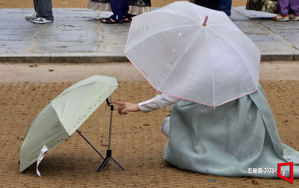 비 내리는날, 경복궁을 찾은 한 외국인 관광객이 소중한 휴대폰이 젖을새라 셀카 한장을 찍기 위해서 휴대폰 위에 우산을 씌우는 모습이 정감 있다. 조용준 기자