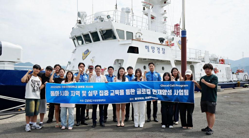 창원해경과 국립창원대 학생들이 해경 함정 앞에서 함께 기념사진을 찍고 있다. 창원해양경찰서 제공