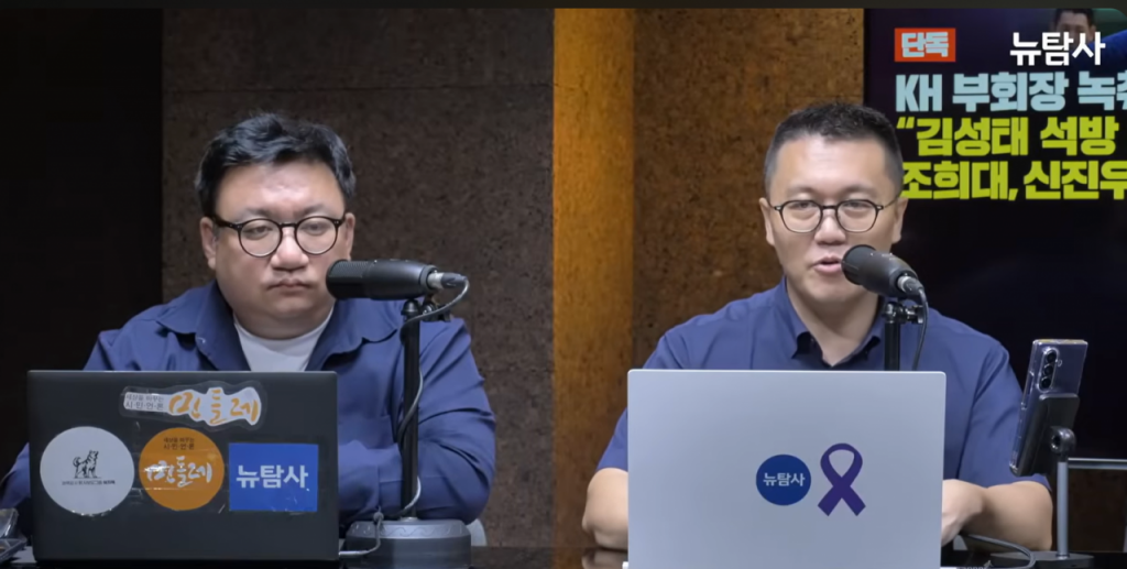 지난 2일 뉴탐사 유튜브 방송에서 뉴탐사 김성진 기자(왼쪽)와 워치독 허재현 기자가 김성태 전 쌍방울 그룹 회장의 석방 로비 의혹을 보도하고 있는 모습. 유튜브 방송 화면 캡처
