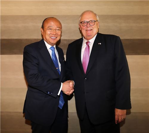 김승연 한화그룹 회장과 헤리티지 재단 창립자인 에드윈 퓰너 박사가 반갑게 인사를 나누고 있다. 한화그룹