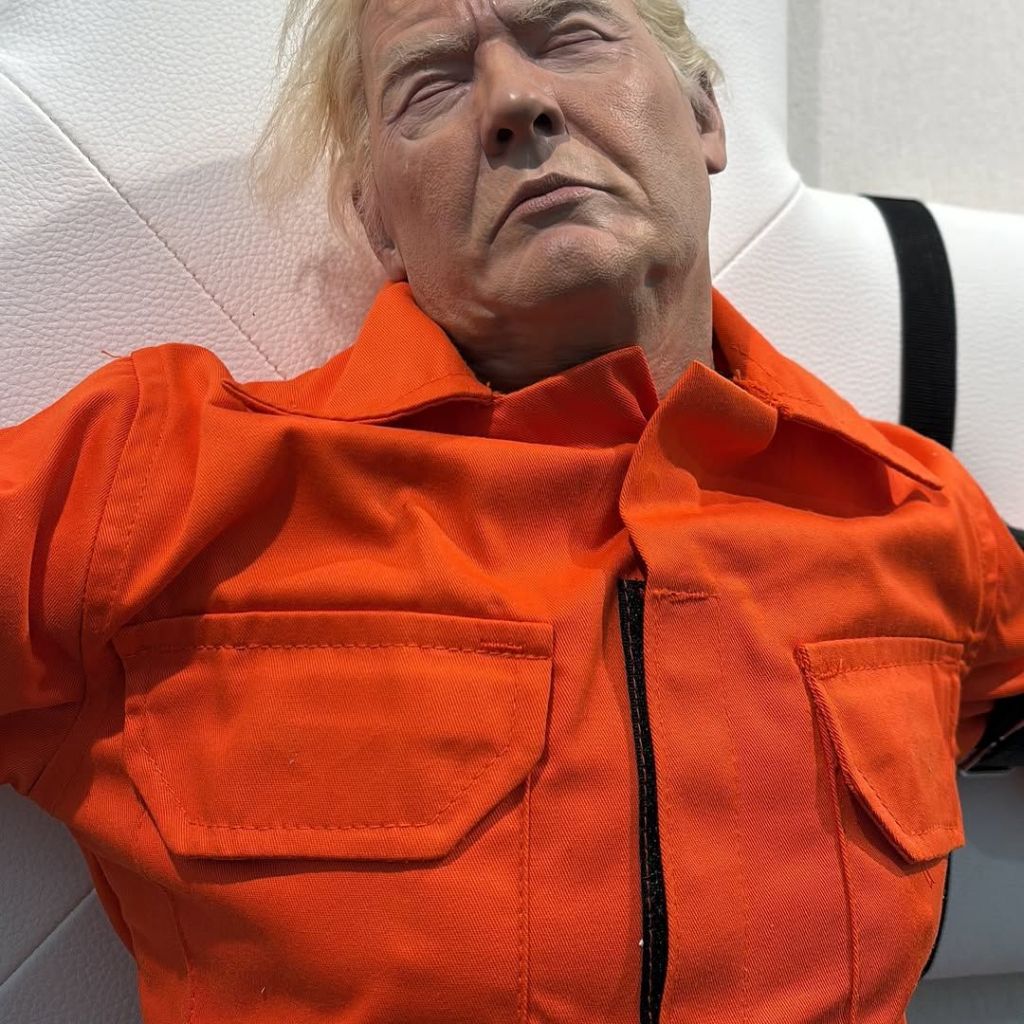 '성인 또는 죄인(Saint or Sinner)'이라는 제목의 이 조각상은 주황색 죄수복 차림의 트럼프 대통령이 팔다리가 묶인 채 십자가에 매달려 얼굴을 찡그리고 있는 모습을 형상화했다. 조각상은 복면으로 얼굴을 가리고 제이슨 스톰이라는 이름을 쓰는 영국 출신 작가가 만들었다. 그는 예술사와 사회 비판을 도발적인 방식으로 다루는 것으로 유명하다. 스톰은 과거 얼굴 없는 예술가 뱅크시의 작품 '위임된 의회(Devolved Parliament)'를 자신이 그렸다고 암시한 바 있다. 두 작가의 관계는 구체적으로 알려지지 않았으나, 일각에서는 스톰이 뱅크시의 조수 작가일 가능성을 제기한다.