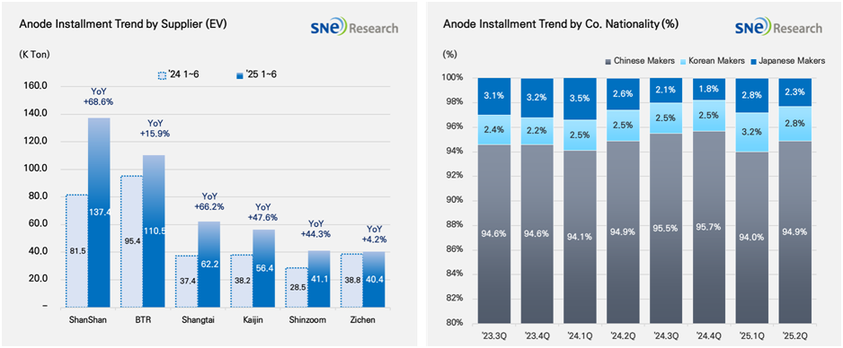 2025년 1~6월 전세계 전기차 배터리 음극재 시장 현황. SNE리서치