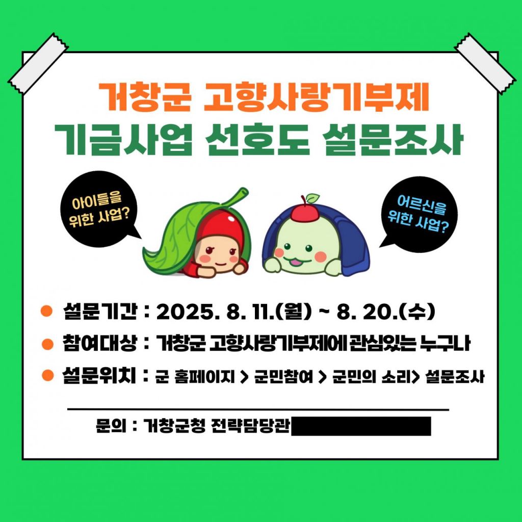 경남 거창군은 2026년 고향 사랑 기금사업 선정을 위해 군민의 의견을 반영하고자 오는 20일까지 고향 사랑 기금사업 선호도 설문조사를 실시한다.