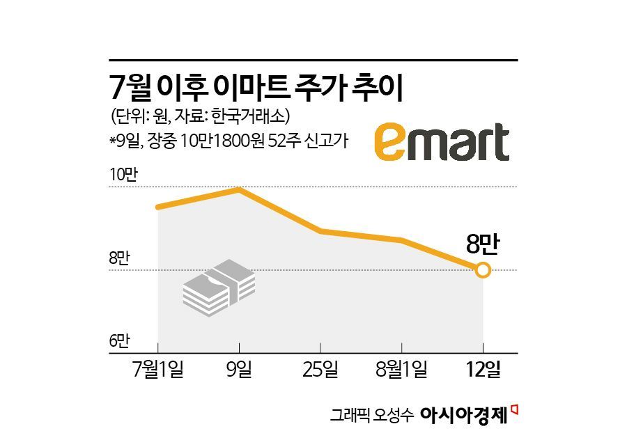 13일 한국거래소에 따르면 전일 이마트는 8.26% 하락한 8만원에 마감했다. 주가는 장중 8만원이 무너지기도 했는데 이마트의 주가가 8만원 아래로 떨어진 것은 올해 4월 초 이후 처음이다.