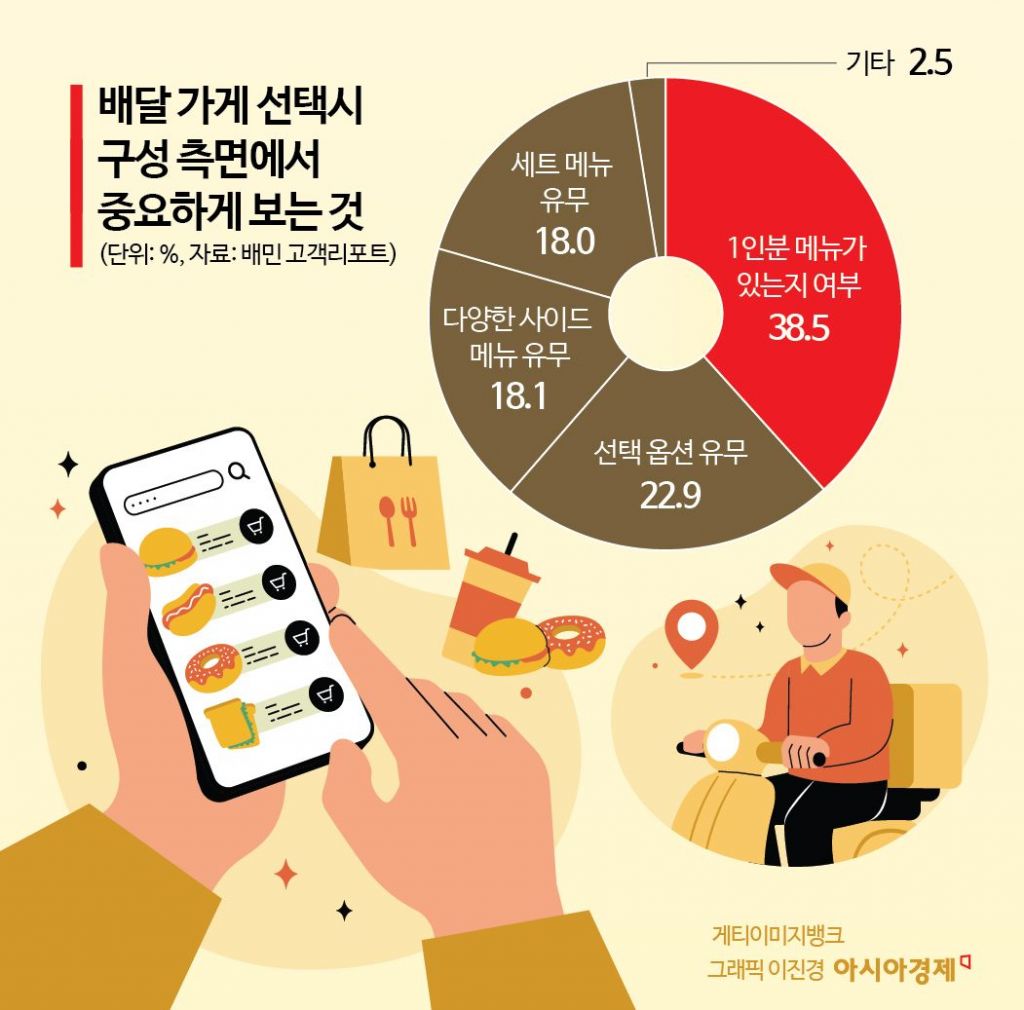 13일 최근 배민이 주 1회 이상 이용 고객 712명을 대상으로 실시한 설문조사에 따르면 배달 앱에서 가게를 선택할 때 38.5%의 사용자가 1인분 메뉴가 있는지 여부를 가장 중요하게 보는 것으로 나타났다. 이 설문 조사에서 응답자의 절반 이상인 53.1%는 1인분 메뉴 주문 경험이 있다고 했으며, 이 중 82.7%가 만족했다는 반응을 보였다. 또 47.3%가 단골 가게에 1인분 주문 메뉴가 새로 생긴다면 자주 이용할 것 같다고 응답했다. 1인분 주문 가능 여부가 배달 가게를 선택하는 데 영향을 주는 주요인이 됐다는 의미다.
