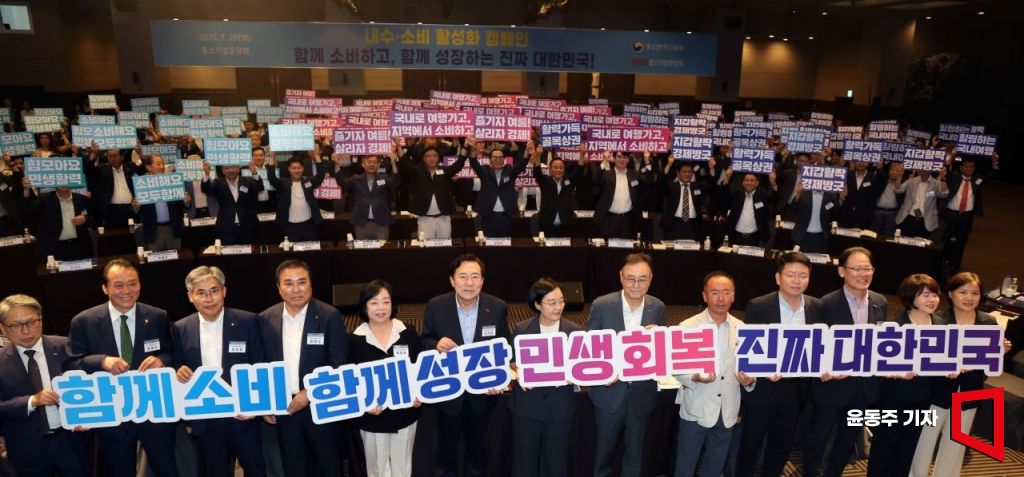 지난달 29일 서울 여의도 중소기업중앙회에서 열린 '중소기업단체와 소통간담회'에 참석한 한성숙 중소벤처기업부 장관과 김기문 중앙회 회장, 기업인들이 '내수소비 활성화 캠페인' 퍼포먼스를 하고 있다. 윤동주 기자