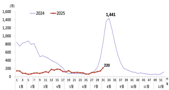 병원급 의료기관 코로나19 입원환자 수(2024년~2025년 31주)(자료: 질병관리청)