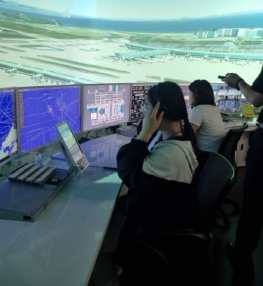 12일 공항체험 프로그램 참가자들이 조종관제 시뮬레이션 체험을 하고 있다. 한국공항공사