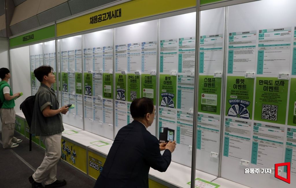 지난 6월 서울 강남구 코엑스에서 열린 강남구 취업박람회를 찾은 구직자들이 채용공고 게시판을 확인하고 있다.