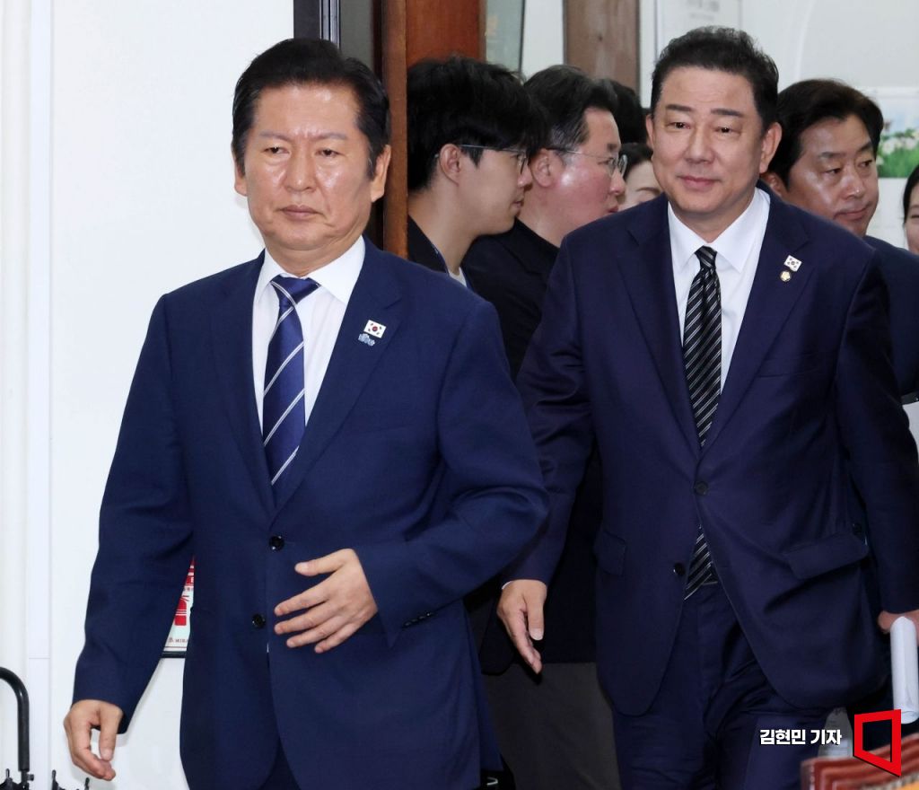 정청래 더불어민주당 대표와 김병기 원내대표가 13일 국회에서 열린 최고위원회의에 참석하고 있다.