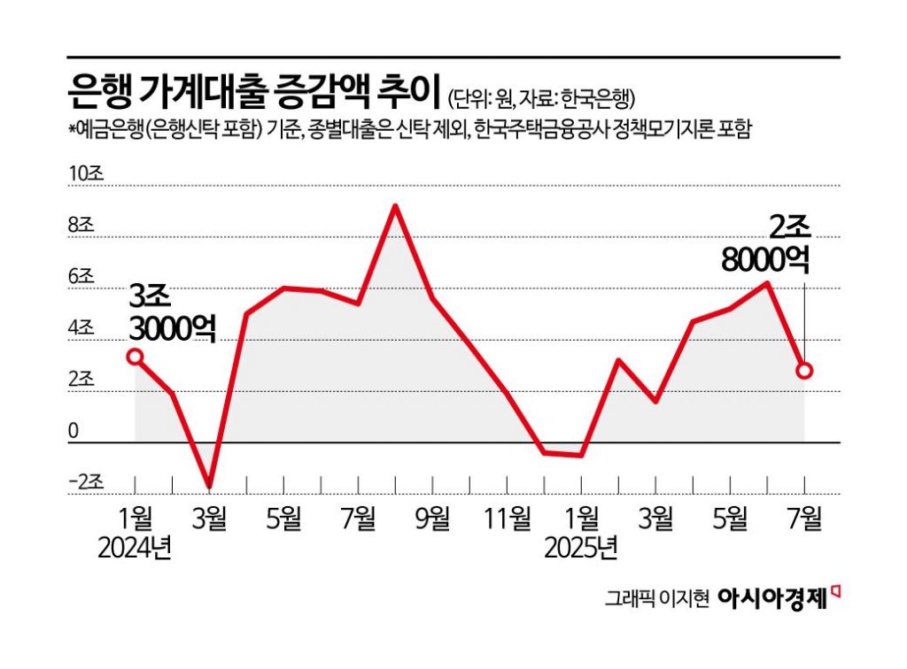 13일 한국은행이 발표한 '2025년 7월 중 금융시장 동향'에 따르면 지난달 말 은행 가계대출 잔액은 1164조2000억원으로 전월 말 대비 2조8000억원 증가했다. 전월(6조2000억원) 대비 증가 규모가 상당폭 줄었다.