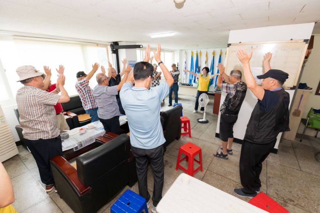 창원시 진해구 월남전참전자회 센터를 찾은 신천지자원봉사단 진해지부 회원들이 참전 용사들과 함께 웃음 체조를 진행하고 있다.