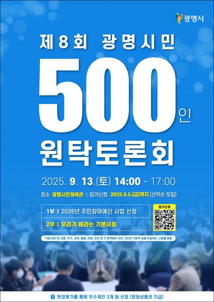 광명시는 다음 달 13일 광명시민체육관에서 '제8회 광명시민 500인 원탁 토론회'를 개최한다고 13일 밝혔다.