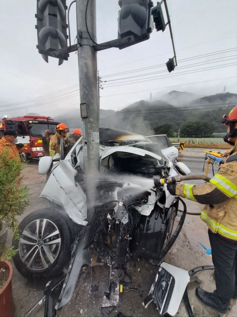 소방 당국에 따르면, 사고 차량은 충돌 직후 내부에 연기가 가득 차며 운전자와 조수석 탑승자가 모두 차 안에 고립됐다. 신고를 받고 출동한 소방대는 오전 7시 8분 화재를 초진하고 7시 13분 완전히 진압했다.