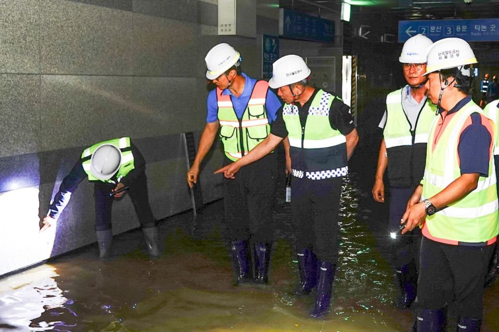 한문희 코레일 사장은 직접 항공대역을 찾아 고객 이동통로 배수 작업을 점검하며 "이용객과 직원 안전을 최우선으로 신속한 복구에 나서 불편을 최소화하겠다"고 말했다.