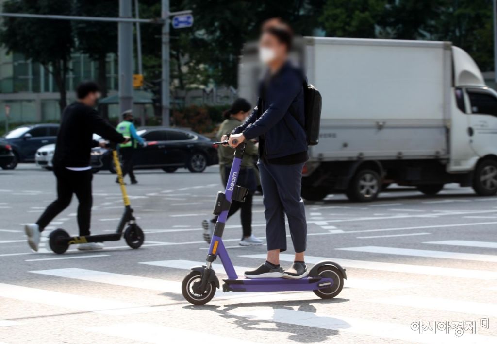 ‘제2종 원동기장치자전거면허’ 이상의 운전면허증 보유자만 전동 킥보드를 탈 수 있고 헬멧 없이 탑승하면 2만 원의 범칙금이 부과된다. 기사 내용과 무관한 자료사진. 김현민 기자