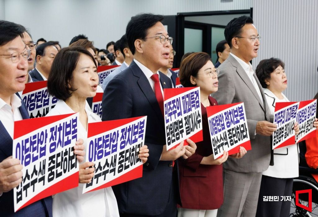 14일 박성훈 국민의힘 수석대변인은 여의도 당사에서 긴급 의총을 마치고 기자들과 만나 "오늘 전당대회 합동 연설회와 폭우 예고를 종합 고려해 오후 특검 방문을 취소했다"고 밝혔다.