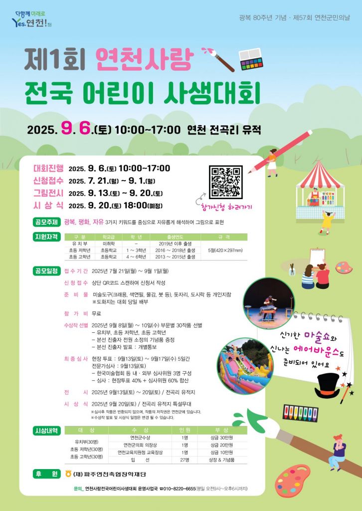 참가 신청은 7월 21일부터 9월 1일까지이며, 유치부(2019년 이후 출생)와 초등부(2013~2018년 출생) 어린이라면 전국 누구나 무료로 참여할 수 있다. 신청은 전국 어린이 사생대회 네이버 폼에서 가능하다.