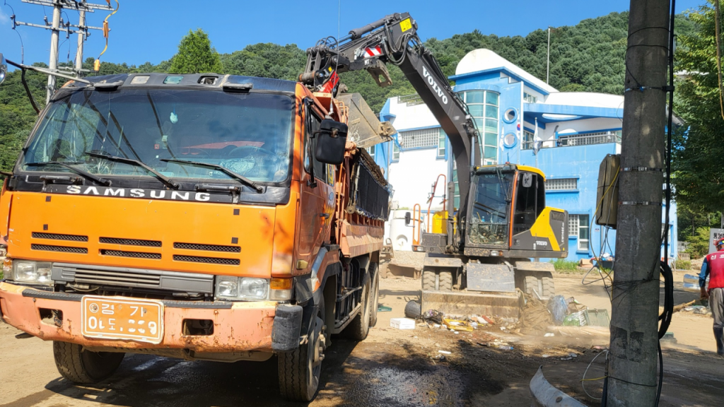 장비업체인 신원건설은 항사리 일대를 중심으로 피해가구와 마을 진입로 토사 정리를 위해 굴착기 등 장비를 무료 지원하며 복구 작업을 벌이고 있다. 가평군 제공